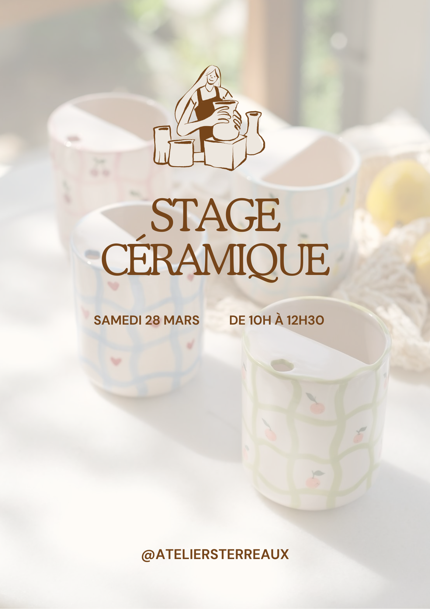 Découvrez une expérience originale alliant plaisir culinaire et création artistique. Rejoignez-nous pour un atelier convivial où vous réaliserez votre propre mug en céramique, guidé(e) par notre professeur. Laissez libre cours à votre imagination pour créer une pièce unique que vous serez fier(e) d’utiliser chez vous !
