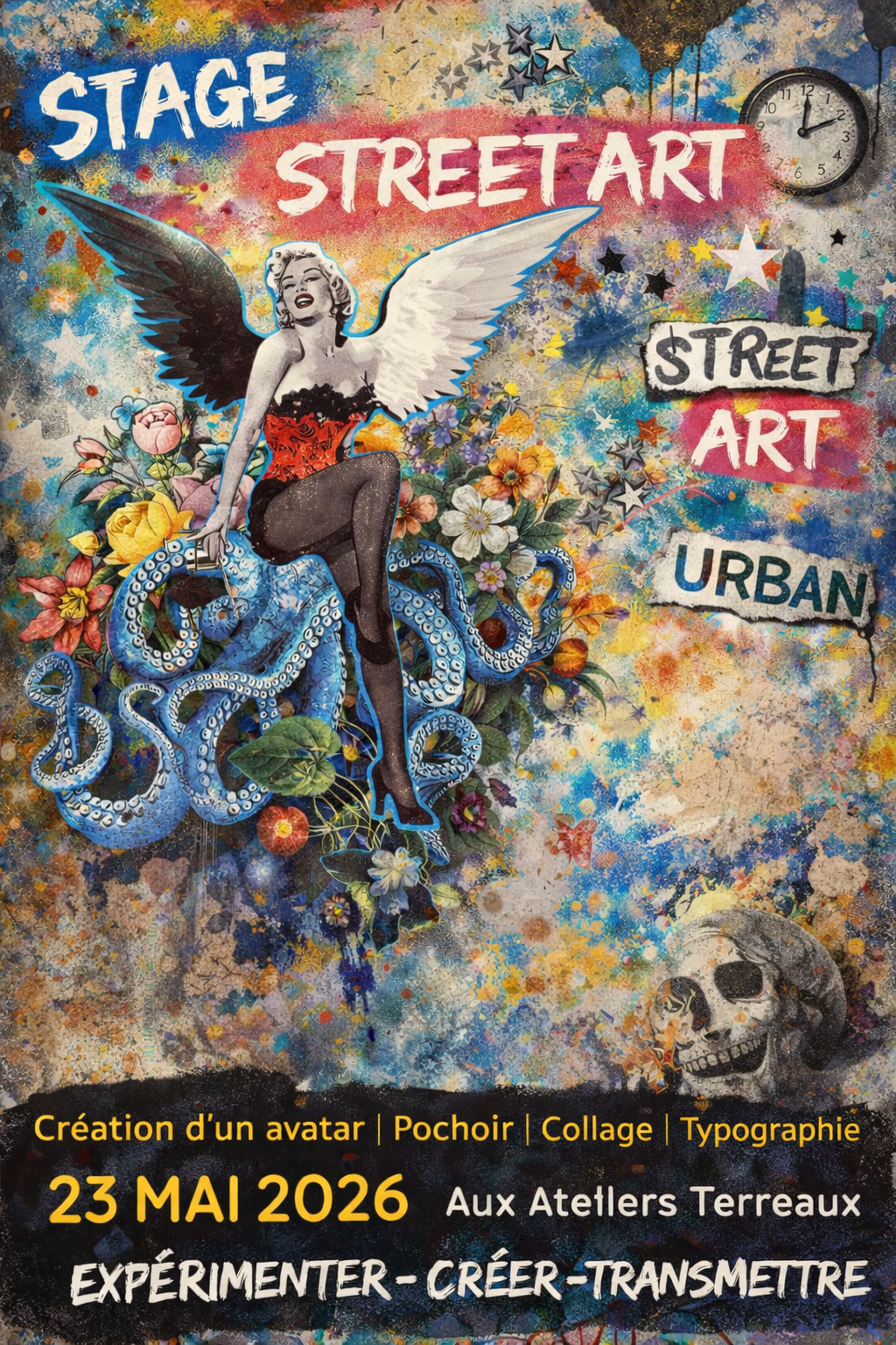 Ce stage propose une immersion dans l’univers du street art à travers une pratique artistique encadrée. Les participants sont invités à imaginer leur propre identité visuelle (avatar), à réfléchir au message qu’ils souhaitent transmettre et à expérimenter différentes techniques issues de l’art urbain : pochoir, collage, typographie et détournement d’images.