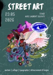 collage Street art Objectif : Créer son propre street art en réfléchissant à sa démarche artistique et en expérimentant différentes techniques. Ce stage propose une immersion dans l’univers du Voir »